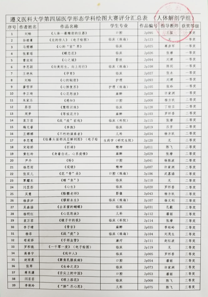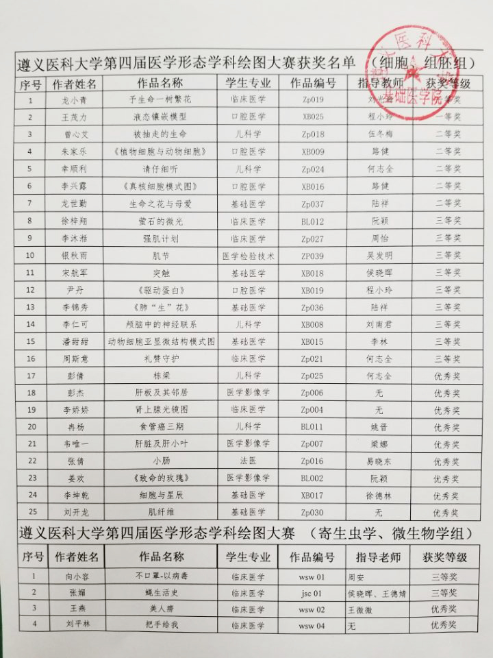 本届大赛作品涵盖人体解剖学、组织与胚胎学、病理学、人体寄生虫学、医学微生物学、细胞生物学等6门形态学科近700幅,作者来自新蒲校区、珠海校区的本科生和研究生。经过初审、终审等评选环节,最后评审出一等奖12幅、二等奖20幅、三等奖36幅、优秀奖41幅。现将获奖作者、作品面向全校公示(见附件)。