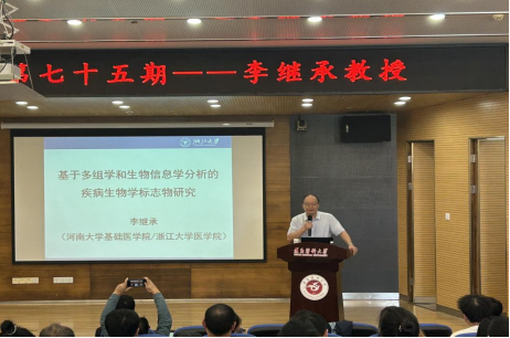 主题二,李继承教授于图书馆一楼多功能厅,作了题为“关于多组学和生物信息学分析的疾病生物学标志物研究”的专题讲座。讲座由tyc5997太阳集团副经理韩勇教授主持,公司党委书记罗军敏教授、副经理刘晖教授出席,全校师生200余人参加。李教授从学术专业角度出发,聚焦精准医学前沿,结合系统生物学、生物信息学、经典分子生物学等学科体系,深入解析了基因组、转录组、蛋白组、代谢组等多组学技术在疾病生物学标志物研究中的科研思路和系统解决方案,探讨了Bulk组学研究、单细胞转录组、空间组学等技术原理和联合分析策略,并分享了目前在肺结核、心肌梗死、新冠病毒、自闭症、抑郁症等方面正在开展且已经取得的生物学标志物相关的原创性研究成果。